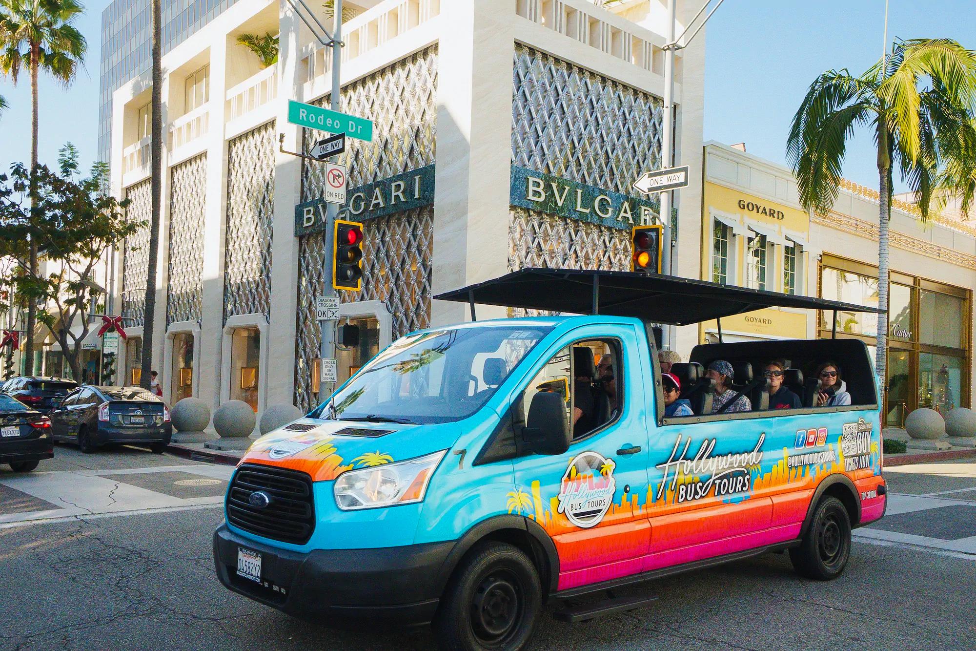 There are two departure locations: the Hollywood Visitor Center on the Hollywood Walk of Fame (near North Sycamore) and the Shore Hotel in Santa Monica (across from the Santa Monica Pier). Please look for the blue and pink buses.